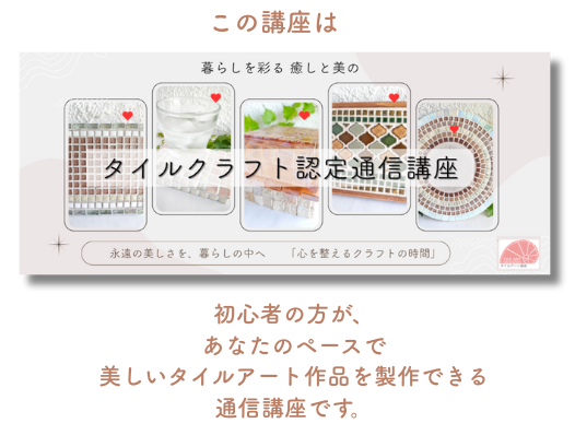 毎日、家事と育児に追われる中で、自分の時間がほとんどありませんでした。この講座でタイルクラフトを始めてから、作品に集中するひとときが、私にとって最高の癒やしになっています。心が整い、前向きな気持ちになれるのを実感しています。